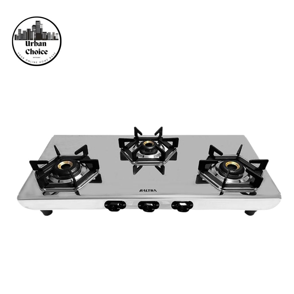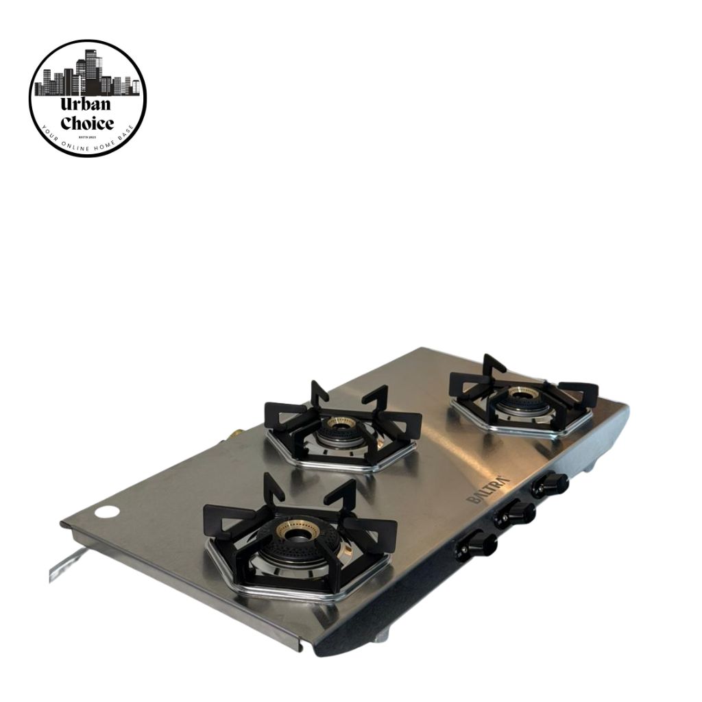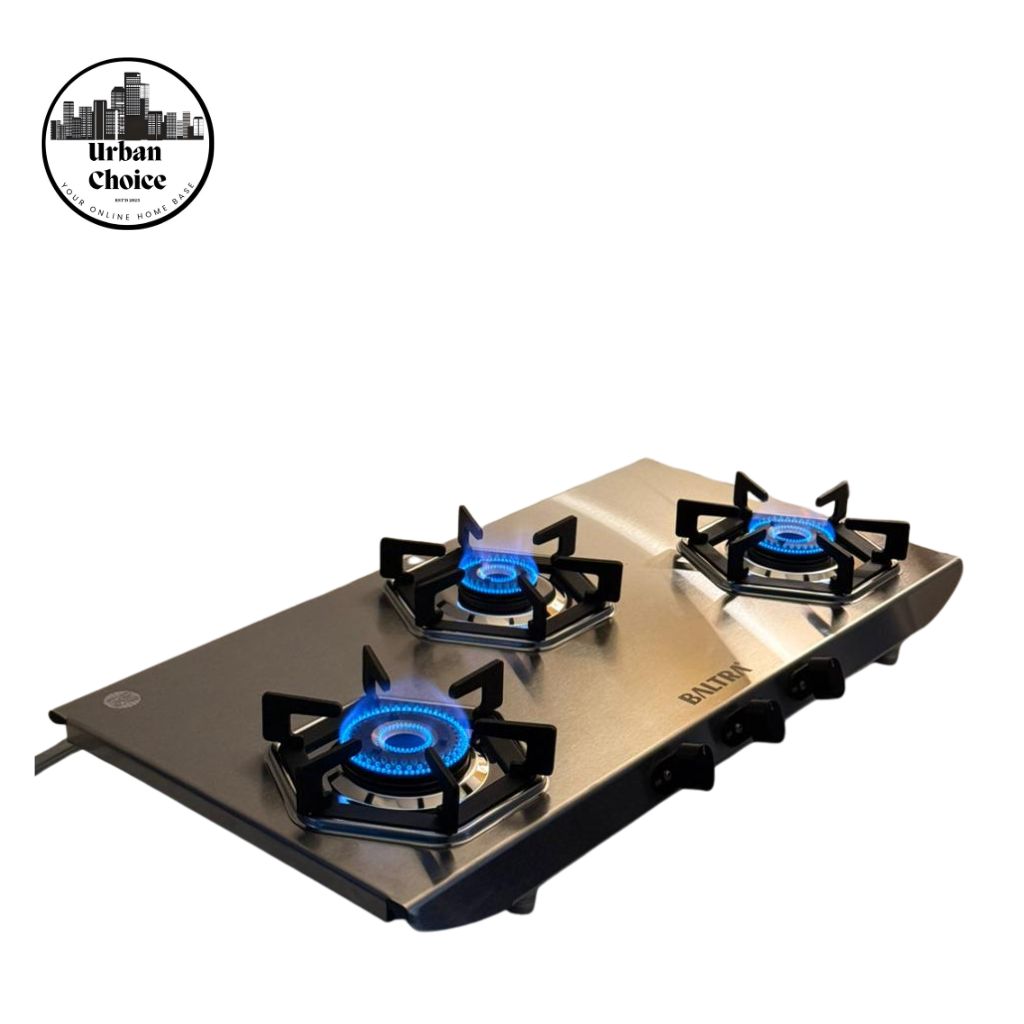 The product in the image is a Baltra Turquoise 3-Burner Gas Stove, a stainless steel cooktop designed for modern kitchens.