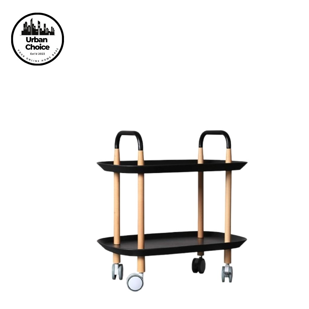 This is a modern, 2-tiered mobile trolley featuring a black finish on the shelves and natural wooden (beech wood or solid wood) support legs/frame. The oval or round shelves have raised edges or guard rails to prevent items from falling. It is equipped with four 360° universal, and often lockable, wheels/casters for easy mobility